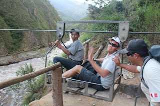 For two hours of the trek we used an origianal Inca trail which as a narrow path built into a cliff face. The views were amazing but you couldn’t help question the sanity of the Inca who chose to build up and along the sheer Andean mountains and not down in the valleys. The Incas however understood the dangers of floods and of land slides which is why they constructed their famous terraces. Almost at the end of our long day of treking we got to a part of the river where the bridge had been washed away. The locals had replaced the bridge with a rudementry cable car which spanned the river for 50 metres, 25 metres above the raging water. To call the crossing a cable car is very generous as it bore more resemblance to a lazy waiter, just a wooden tray big enough for two people to sit on attached to the cable by a Y frame.