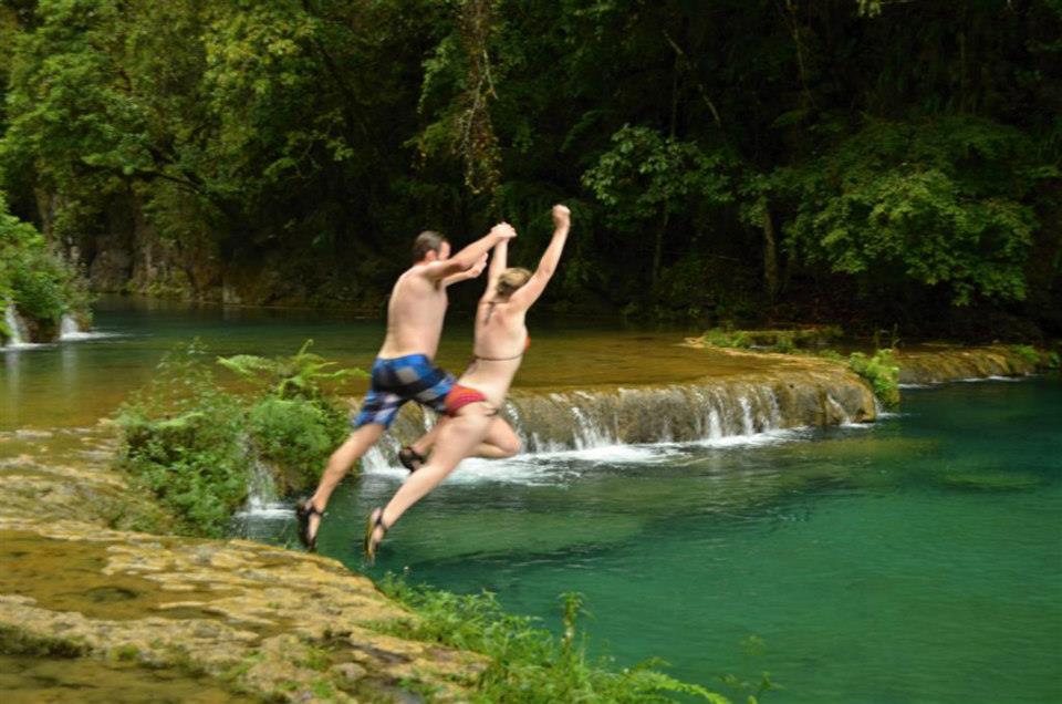 Despite the overcast day the pools were refreshing without being too cold to properly enjoy them. As one pool flowed into another, the water cut through the limestone creating natural slides of which some were and were not safe to slide down. Our Mayan guide talked us through each slide telling us where to put our arms and which direction to point but that didn´t stop a number of us who bumped and bounced unceremoniously down the slides gaining new bruises as we went. I can adequately describe the beauty of this place and pictures don´t really do it justice. Another traveller we met before visiting Semuc Champey said it was the most beautiful place she had ever seen, and while I have seen some contenders for this title on this trip alone, it is definitely up there. The remoteness of the area, the unspoilt forest and high cliffs flanking either side of the river and the quality of the crystal clear water all contribute to the almost mystical aura of Semuc Champey.